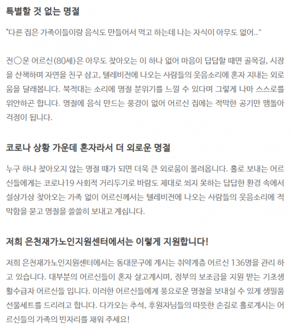 추석명절선물 지원을 위한 모금활동