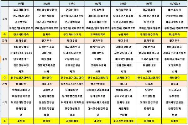 11월넷째주식단표 페이지 정보 작성자 은천노인복지회 작성일19-11-27 09:21 조회38,174회 댓글0건 관련링크 이전글 다음글 목록 답변 본문 ※ 모든 식사에는 잡곡밥과 김치가 제공됩니다. ※ 식단은 식재료수급에 의해 변경될 수 있습니다. 이전글 다음글 목록 답변