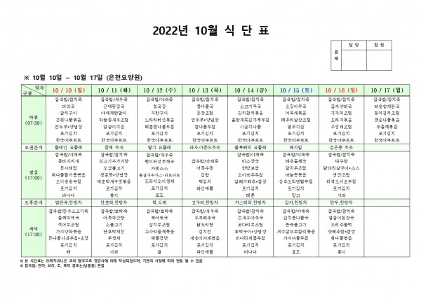 10월 둘째주 식단표 페이지 정보 작성자 은천노인복지회 작성일22-10-06 15:49 조회90,456회 댓글0건 관련링크 이전글 다음글 목록 답변 본문 . 이전글 다음글 목록 답변
