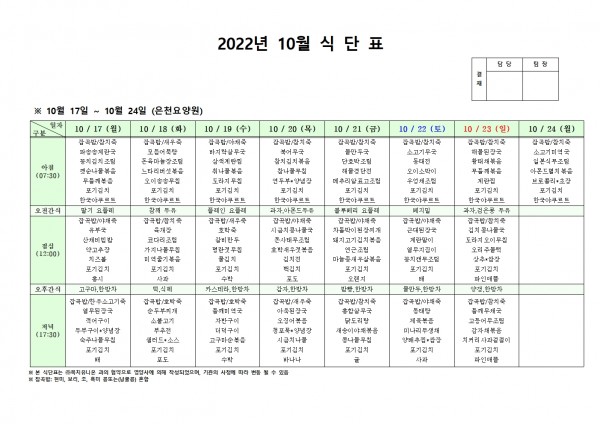 10월 셋째주 식단표 페이지 정보 작성자 은천노인복지회 작성일22-10-13 17:30 조회89,888회 댓글0건 관련링크 이전글 다음글 목록 답변 본문 . 이전글 다음글 목록 답변