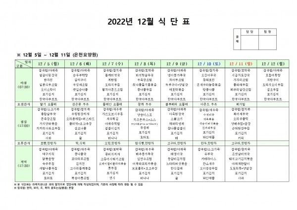 12월 첫째주 식단표 페이지 정보 작성자 은천노인복지회 작성일22-12-01 17:14 조회85,061회 댓글0건 관련링크 이전글 다음글 목록 답변 본문 . 이전글 다음글 목록 답변