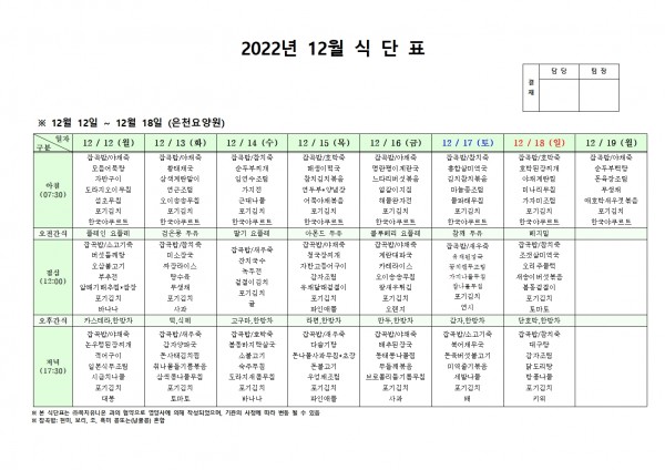 12월 둘째주 식단표 페이지 정보 작성자 은천노인복지회 작성일22-12-08 14:20 조회84,311회 댓글0건 관련링크 이전글 다음글 목록 답변 본문 . 이전글 다음글 목록 답변