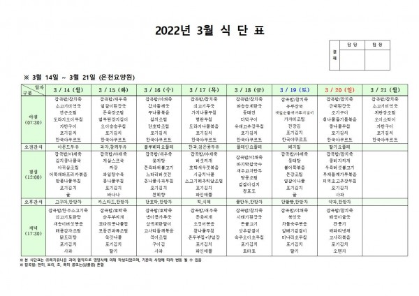 3월 셋째주 식단표 페이지 정보 작성자 은천노인복지회 작성일22-03-11 16:43 조회109,889회 댓글0건 관련링크 이전글 다음글 목록 답변 본문 . 이전글 다음글 목록 답변