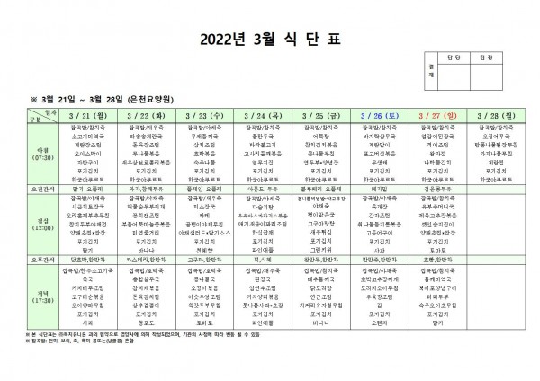 3월 넷째주 식단표 페이지 정보 작성자 은천노인복지회 작성일22-03-17 17:31 조회108,742회 댓글0건 관련링크 이전글 다음글 목록 답변 본문 . 이전글 다음글 목록 답변