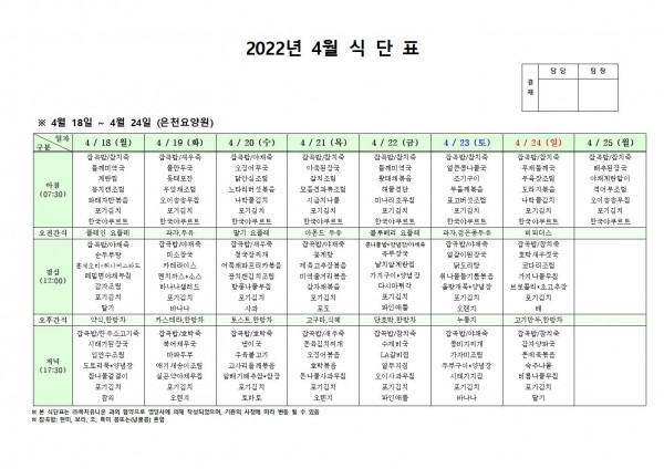 4월 셋째주 식단표 페이지 정보 작성자 은천노인복지회 작성일22-04-14 17:03 조회105,307회 댓글0건 관련링크 이전글 다음글 목록 답변 본문 . 이전글 다음글 목록 답변
