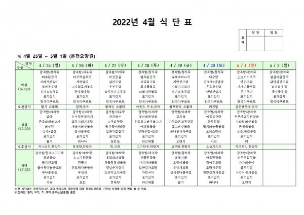 4월 넷째주 식단표 페이지 정보 작성자 은천노인복지회 작성일22-04-22 15:56 조회105,138회 댓글0건 관련링크 이전글 다음글 목록 답변 본문 . 이전글 다음글 목록 답변