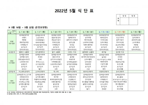 5월 셋째주 식단표 페이지 정보 작성자 은천노인복지회 작성일22-05-12 10:54 조회101,233회 댓글0건 관련링크 이전글 다음글 목록 답변 본문 . 이전글 다음글 목록 답변