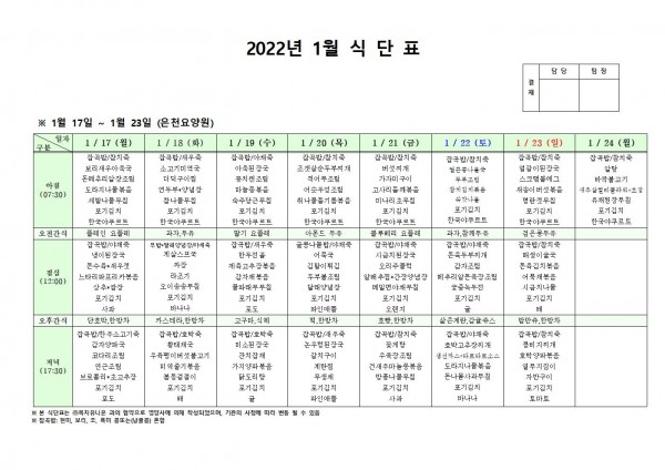 1월 셋째주 식단표 페이지 정보 작성자 은천노인복지회 작성일22-01-25 09:24 조회115,343회 댓글0건 관련링크 이전글 다음글 목록 답변 본문 . 이전글 다음글 목록 답변