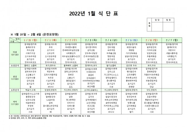2월 첫째주 식단표 페이지 정보 작성자 은천노인복지회 작성일22-01-29 11:54 조회114,065회 댓글0건 관련링크 이전글 다음글 목록 답변 본문 . 이전글 다음글 목록 답변