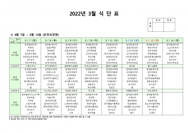 3월 둘째주 식단표 페이지 정보 작성자 은천노인복지회 작성일22-03-04 09:58 조회109,875회 댓글0건 관련링크 이전글 다음글 목록 답변 본문 . 이전글 다음글 목록 답변