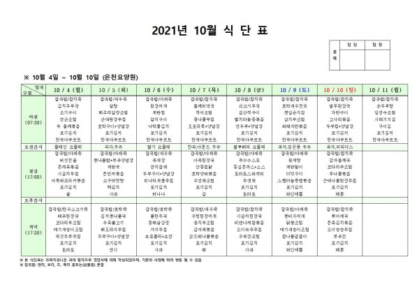 10월 첫째주 식단표 페이지 정보 작성자 은천노인복지회 작성일21-09-30 16:01 조회122,741회 댓글0건 관련링크 이전글 다음글 목록 답변 본문 . 이전글 다음글 목록 답변