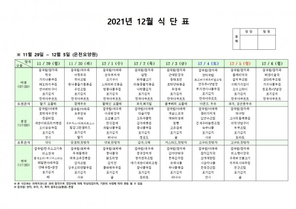 12월 첫째주 식단표 페이지 정보 작성자 은천노인복지회 작성일21-11-25 17:12 조회119,959회 댓글0건 관련링크 이전글 다음글 목록 답변 본문 . 이전글 다음글 목록 답변