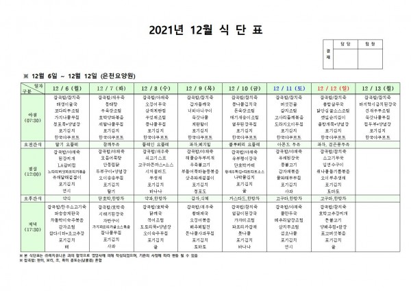 12월 둘째주 식단표 페이지 정보 작성자 은천노인복지회 작성일21-12-03 10:52 조회118,796회 댓글0건 관련링크 이전글 다음글 목록 답변 본문 . 이전글 다음글 목록 답변