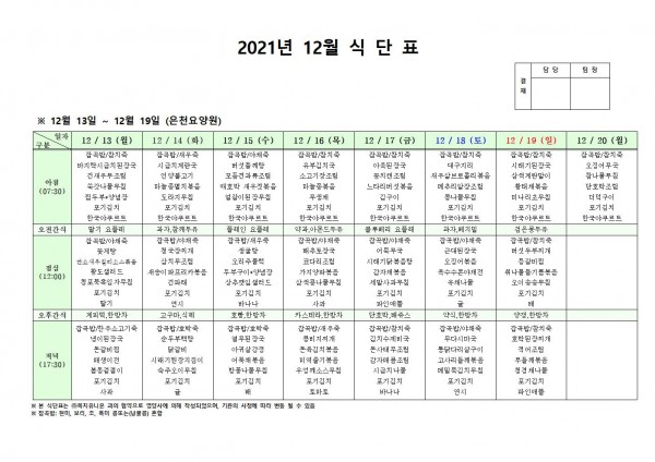 12월 셋째주 식단표 페이지 정보 작성자 은천노인복지회 작성일21-12-15 11:52 조회117,986회 댓글0건 관련링크 이전글 다음글 목록 답변 본문 . 이전글 다음글 목록 답변