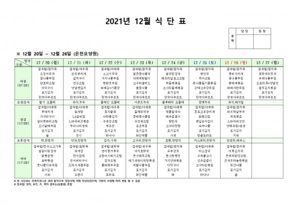 12월 넷째주 식단표 페이지 정보 작성자 은천노인복지회 작성일21-12-16 17:24 조회117,472회 댓글0건 관련링크 이전글 다음글 목록 답변 본문 . 이전글 다음글 목록 답변