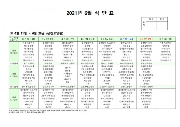 6월 넷째주 식단표 페이지 정보 작성자 은천노인복지회 작성일21-06-17 15:01 조회129,014회 댓글0건 관련링크 이전글 다음글 목록 답변 본문 . 이전글 다음글 목록 답변