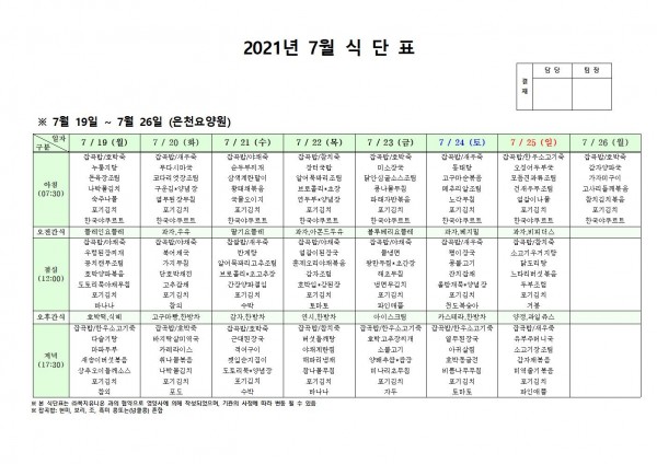7월 셋째주 식단표 페이지 정보 작성자 은천노인복지회 작성일21-07-22 11:18 조회127,951회 댓글0건 관련링크 이전글 다음글 목록 답변 본문 . 이전글 다음글 목록 답변
