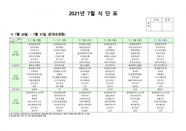 7월 넷째주 식단표 페이지 정보 작성자 은천노인복지회 작성일21-08-05 10:26 조회127,020회 댓글0건 관련링크 이전글 다음글 목록 답변 본문 . 이전글 다음글 목록 답변