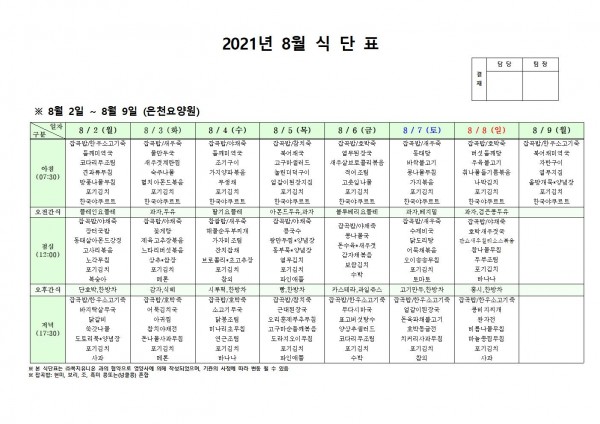 8월 첫째주 식단표 페이지 정보 작성자 은천노인복지회 작성일21-08-05 10:26 조회127,045회 댓글0건 관련링크 이전글 다음글 목록 답변 본문 . 이전글 다음글 목록 답변