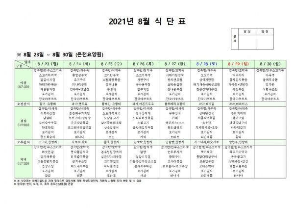 8월 넷째주 식단표 페이지 정보 작성자 은천노인복지회 작성일21-08-19 17:44 조회126,381회 댓글0건 관련링크 이전글 다음글 목록 답변 본문 . 이전글 다음글 목록 답변