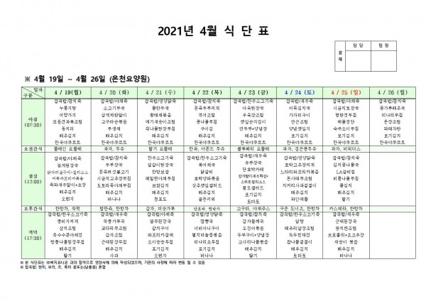 4월 셋째주 식단표 페이지 정보 작성자 은천노인복지회 작성일21-04-15 19:35 조회135,617회 댓글0건 관련링크 이전글 다음글 목록 답변 본문 4월 셋째주 식단표 이전글 다음글 목록 답변