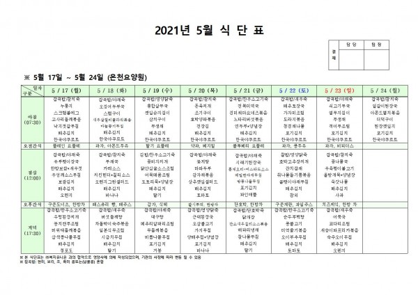 5월 셋째주 식단표 페이지 정보 작성자 은천노인복지회 작성일21-05-13 19:27 조회131,898회 댓글0건 관련링크 이전글 다음글 목록 답변 본문 5월 셋째주 식단표 이전글 다음글 목록 답변
