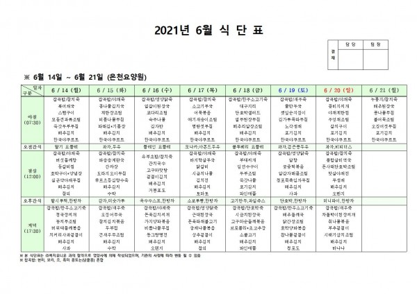 6월 셋째주 식단표 페이지 정보 작성자 은천노인복지회 작성일21-06-11 10:28 조회129,450회 댓글0건 관련링크 이전글 다음글 목록 답변 본문 . 이전글 다음글 목록 답변