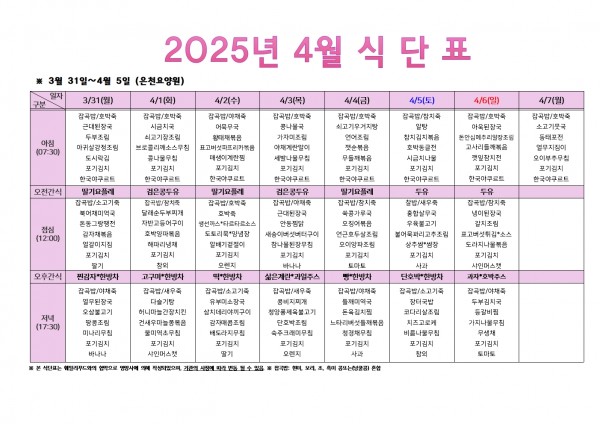 2025년 4월 첫주 식단표 페이지 정보 작성자 은천노인복지회 작성일25-03-28 10:25 조회8,986회 댓글0건 관련링크 이전글 다음글 목록 답변 본문 . 이전글 다음글 목록 답변