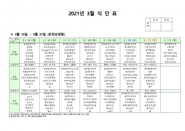 3월 셋째주 식단표 페이지 정보 작성자 은천노인복지회 작성일21-03-12 11:41 조회139,156회 댓글0건 관련링크 이전글 다음글 목록 답변 본문 3월 셋째주 식단표[이 게시물은 은천노인복지회님에 의해 2021-03-12 17:18:24 공지사항에서 이동 됨] 이전글 다음글 목록 답변