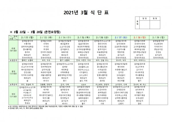 3월 넷째주 식단표 페이지 정보 작성자 은천노인복지회 작성일21-03-18 17:41 조회138,982회 댓글0건 관련링크 이전글 다음글 목록 답변 본문 3월 넷째주 식단표 이전글 다음글 목록 답변