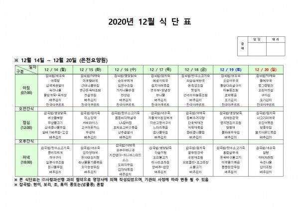 12월 셋째주 식단표 페이지 정보 작성자 은천노인복지회 작성일20-12-15 13:41 조회148,754회 댓글0건 관련링크 이전글 다음글 목록 답변 본문 . 이전글 다음글 목록 답변