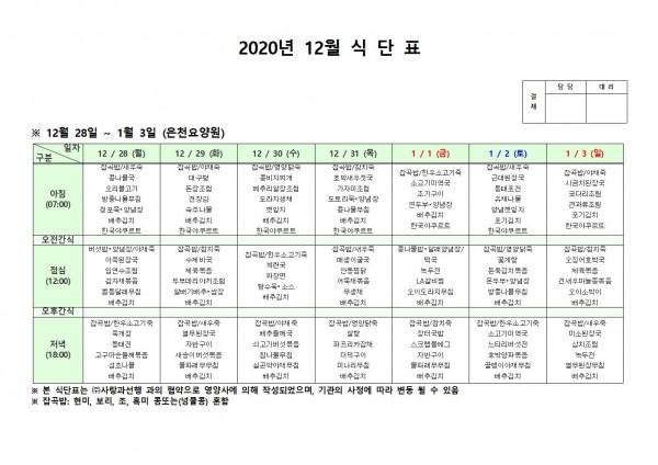 12월 다섯째주 식단표 페이지 정보 작성자 은천노인복지회 작성일20-12-24 18:17 조회145,162회 댓글0건 관련링크 이전글 다음글 목록 답변 본문 . 이전글 다음글 목록 답변