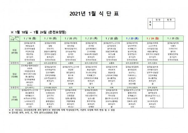 1월 셋째주 식단표 페이지 정보 작성자 은천노인복지회 작성일21-01-15 10:02 조회143,640회 댓글0건 관련링크 이전글 다음글 목록 답변 본문 . 이전글 다음글 목록 답변