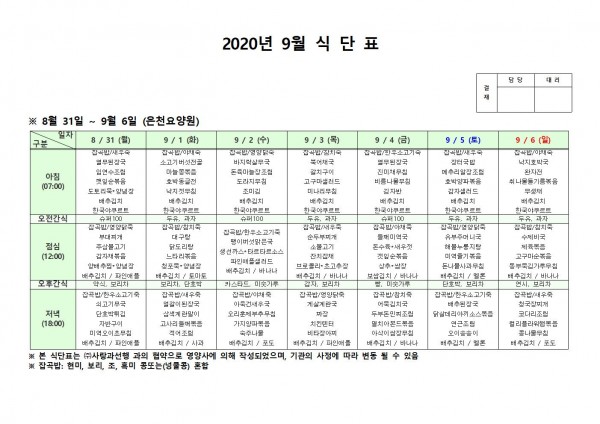 9월 첫째주 식단표 페이지 정보 작성자 은천노인복지회 작성일20-09-07 14:40 조회158,091회 댓글0건 관련링크 이전글 다음글 목록 답변 본문 * 이전글 다음글 목록 답변