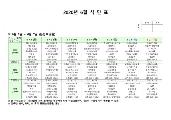 6월 첫째주 식단표 페이지 정보 작성자 은천노인복지회 작성일20-06-09 09:32 조회166,005회 댓글0건 관련링크 이전글 다음글 목록 답변 본문 호 이전글 다음글 목록 답변
