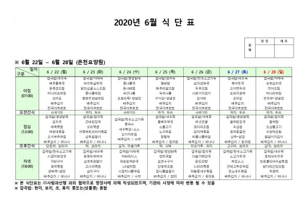 6월 넷째주 식단표 페이지 정보 작성자 은천노인복지회 작성일20-06-29 16:32 조회165,687회 댓글0건 관련링크 이전글 다음글 목록 답변 본문 . 이전글 다음글 목록 답변