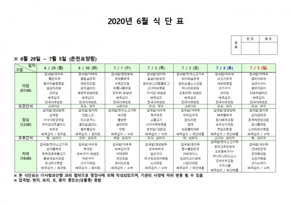 7월 첫째주 식단표 페이지 정보 작성자 은천노인복지회 작성일20-07-08 11:02 조회164,583회 댓글0건 관련링크 이전글 다음글 목록 답변 본문 . 이전글 다음글 목록 답변