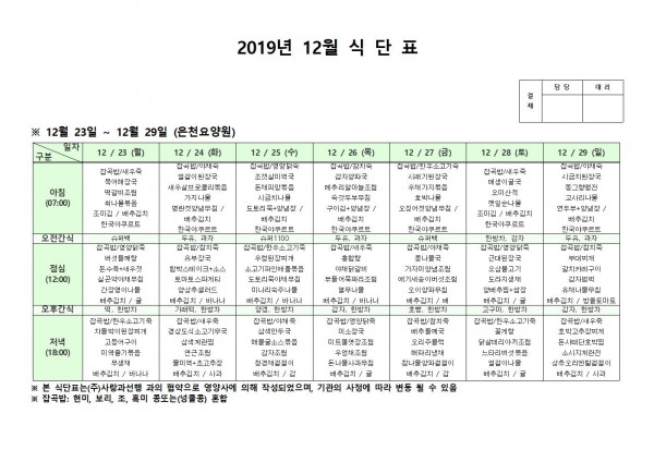 12월 넷째주 식단표 페이지 정보 작성자 은천노인복지회 작성일19-12-30 14:32 조회183,755회 댓글0건 관련링크 이전글 다음글 목록 답변 본문 12월 넷째주 식단표입니다 이전글 다음글 목록 답변