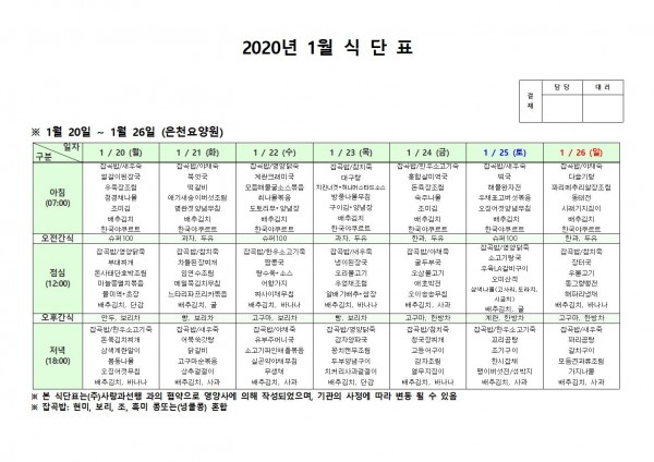 1월 셋째주 식단표 페이지 정보 작성자 은천노인복지회 작성일20-01-28 14:25 조회180,622회 댓글0건 관련링크 이전글 다음글 목록 답변 본문 1월 셋째주 식단표입니다. 이전글 다음글 목록 답변