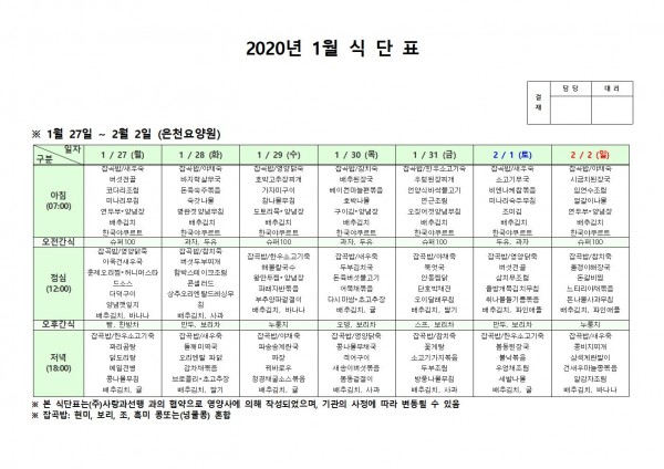 1월 넷째주 식단표 페이지 정보 작성자 은천노인복지회 작성일20-02-04 09:37 조회179,308회 댓글0건 관련링크 이전글 다음글 목록 답변 본문 1월 넷째주 식단표입니다. 이전글 다음글 목록 답변