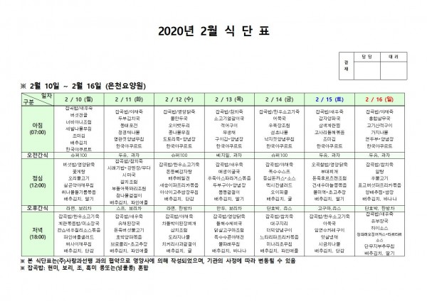 2월 둘째주 식단표 페이지 정보 작성자 은천노인복지회 작성일20-02-17 10:27 조회177,025회 댓글0건 관련링크 이전글 다음글 목록 답변 본문 ㅇㅅㅇ 이전글 다음글 목록 답변