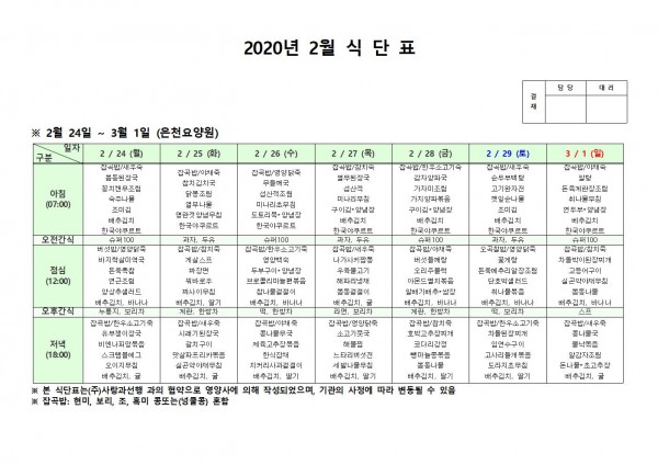 2월 넷째주 식단표 페이지 정보 작성자 은천노인복지회 작성일20-03-02 13:41 조회175,237회 댓글0건 관련링크 이전글 다음글 목록 답변 본문 2월 넷째주 식단표입니다 이전글 다음글 목록 답변