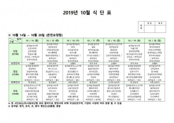 10월 셋째주 식단표 페이지 정보 작성자 은천노인복지회 작성일19-10-21 15:50 조회188,419회 댓글0건 관련링크 이전글 다음글 목록 답변 본문 10월 셋째주 식단표 이전글 다음글 목록 답변