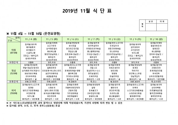 11월 첫째주 식단표 페이지 정보 작성자 은천노인복지회 작성일19-11-12 14:17 조회187,937회 댓글0건 관련링크 이전글 다음글 목록 답변 본문 11월 첫째주 식단표 이전글 다음글 목록 답변