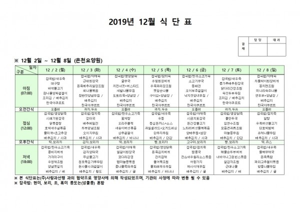 12월 첫째주 식단표 페이지 정보 작성자 은천노인복지회 작성일19-12-11 09:51 조회184,539회 댓글0건 관련링크 이전글 다음글 목록 답변 본문 12월 첫째주 식단표 이전글 다음글 목록 답변