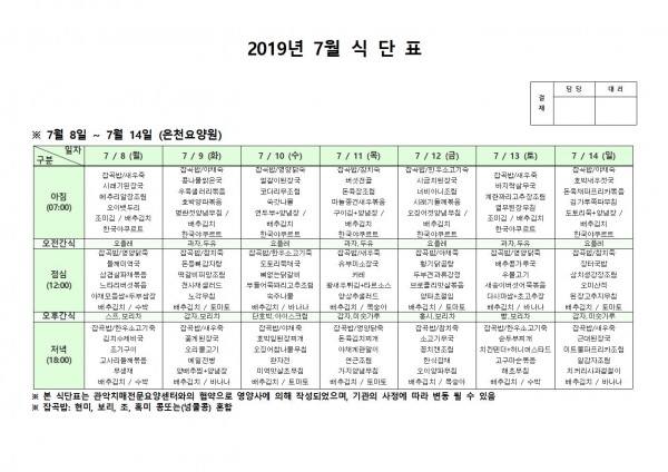 7월 둘째주 식단표 페이지 정보 작성자 은천노인복지회 작성일19-07-15 10:56 조회193,849회 댓글0건 관련링크 이전글 다음글 목록 답변 본문 7월 둘째주 식단표 이전글 다음글 목록 답변