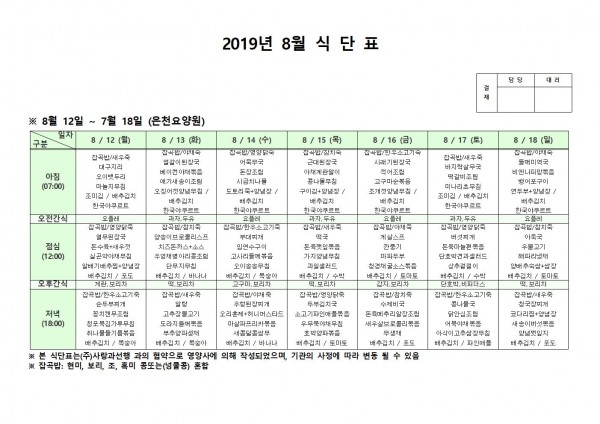 8월 셋째주 식단표 페이지 정보 작성자 은천노인복지회 작성일19-08-19 15:35 조회192,086회 댓글0건 관련링크 이전글 다음글 목록 답변 본문 8월 셋째주 식단표 이전글 다음글 목록 답변