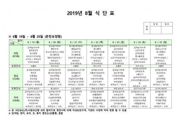 8월 넷째주 식단표 페이지 정보 작성자 은천노인복지회 작성일19-08-26 16:38 조회190,931회 댓글0건 관련링크 이전글 다음글 목록 답변 본문 8월 넷째주 식단표 이전글 다음글 목록 답변