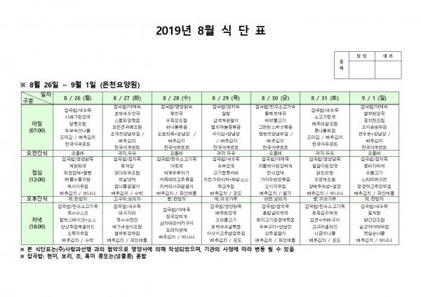 8월 다섯째주 식단표 페이지 정보 작성자 은천노인복지회 작성일19-09-04 17:29 조회192,335회 댓글0건 관련링크 이전글 다음글 목록 답변 본문 8월 다섯째주 식단표 이전글 다음글 목록 답변