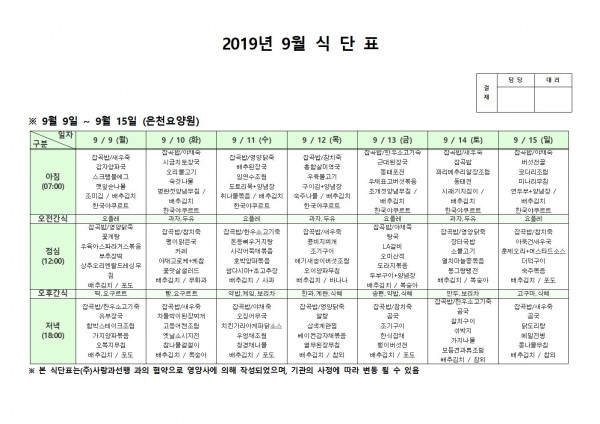 9월 둘째주 식단표 페이지 정보 작성자 은천노인복지회 작성일19-09-23 13:26 조회191,802회 댓글0건 관련링크 이전글 다음글 목록 답변 본문 . 이전글 다음글 목록 답변